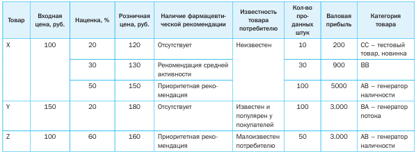 Неизвестная покупателю товарная позиция X в случае если она имеет наценку 20% и её неактивно рекомендуют фармацевты относится к категории СС – тестовых товаров, товаров-новинок. Если на этот же товар поставить наценку 30% и первостольники поддержат товар фармацевтической рекомендацией средней активности (второго приоритета), то товар может перейти в категории BB. А если наценка на позицию X составит 50% и фармацевты обеспечат приоритетную рекомендацию, то возможен перевод этого товара в категорию AB – генератора наличности.