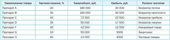 Генераторы прибыли – товары с высокой наценкой и высоким (и, как правило, стабильным) уровнем продаж. Важно, чтобы для их поддержки работало большинство генераторов в категории. Фокус работы сотрудников ап теки должен быть направлен на работу именно с этими позициями.
