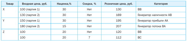 Товарная позиция X сначала поступила в аптеку от фармдистрибьютора по цене 100 руб. (партия 1), а при следующей поставке по цене 130 руб. (партия 2); в аптеке на обе эти партии поставили наценку 30%, таким образом, в аптеке присутствуют один и тот же товар по разной цене. Если предположить, что исходно товар относился к категории BB, то при абсолютном увеличении наценки и неизменном уровне продаж, он может перейти в категорию генератора наличности – AB.