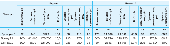 В таблице представлен пример увеличения прибыльности одной терапевтической категории в реальной аптечной сети при изменении наценки на некоторые товары и подключения активной рекомендации «первостольников».